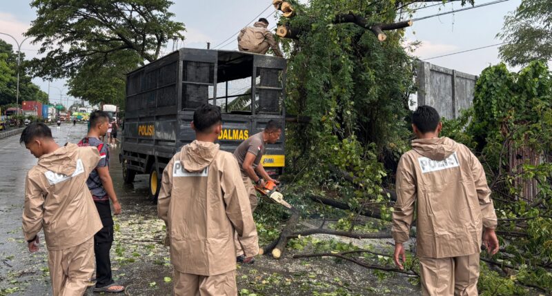 Mengetahui adanya kejadian tersebut, Satuan Samapta Polres Demak sigap bergerak cepat ke lokasi untuk melakukan evakuasi. Dengan menggunakan gergaji mesin dan peralatan manual, petugas berupaya memotong batang pohon yang roboh agar akses jalan segera bisa dilalui kembali oleh masyarakat.